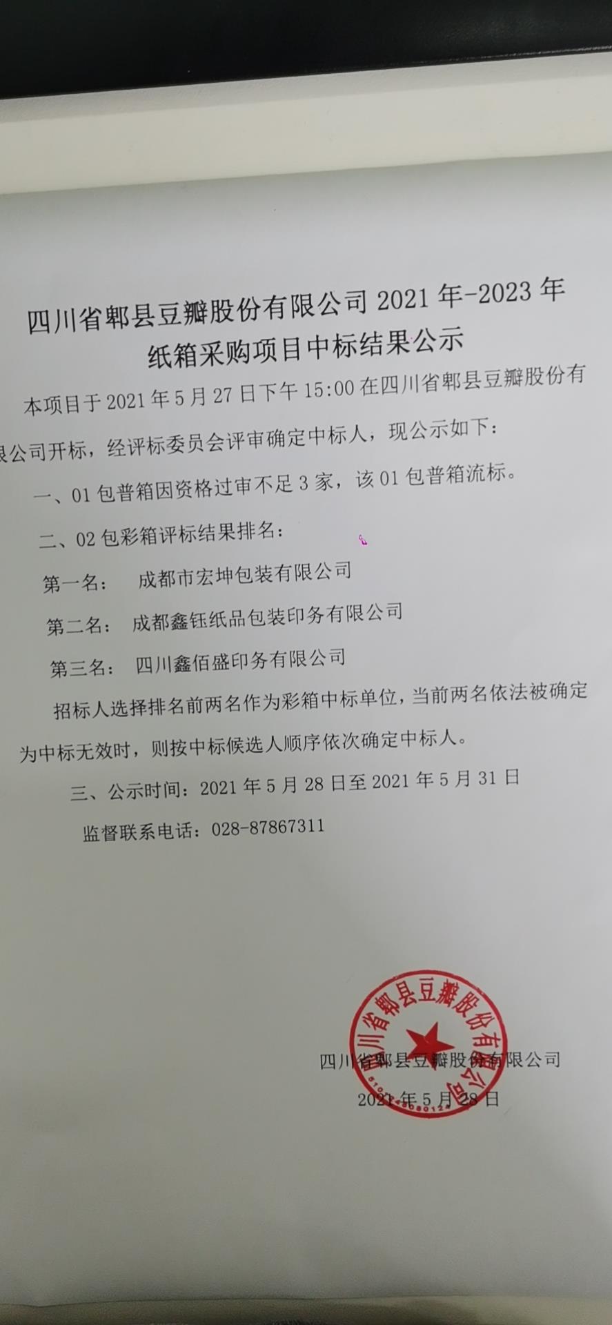 郫县豆瓣2021年纸箱采购项目竞争性探讨效果公示